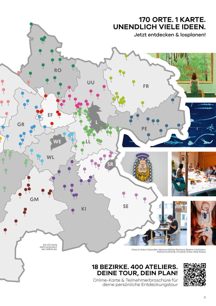 Zur Gestaltung eines individuellen Besuchsprogramms durch die Ateliers und Galerien am “Tage der offenen Ateliers” -Wochenende steht eine interaktive Oberösterreich-Karte zur Verfügung. Darin sind alle Mitwirkenden mit Informationen zu den Kunstsparten, Öffnungszeiten und Kontaktmöglichkeiten eingezeichnet. Die Planung von Besuchen kann dadurch einfach gestaltet werden und verleitet regelrecht zu Ateliertouren durch Oberösterreich. (Quelle: Land OÖ)