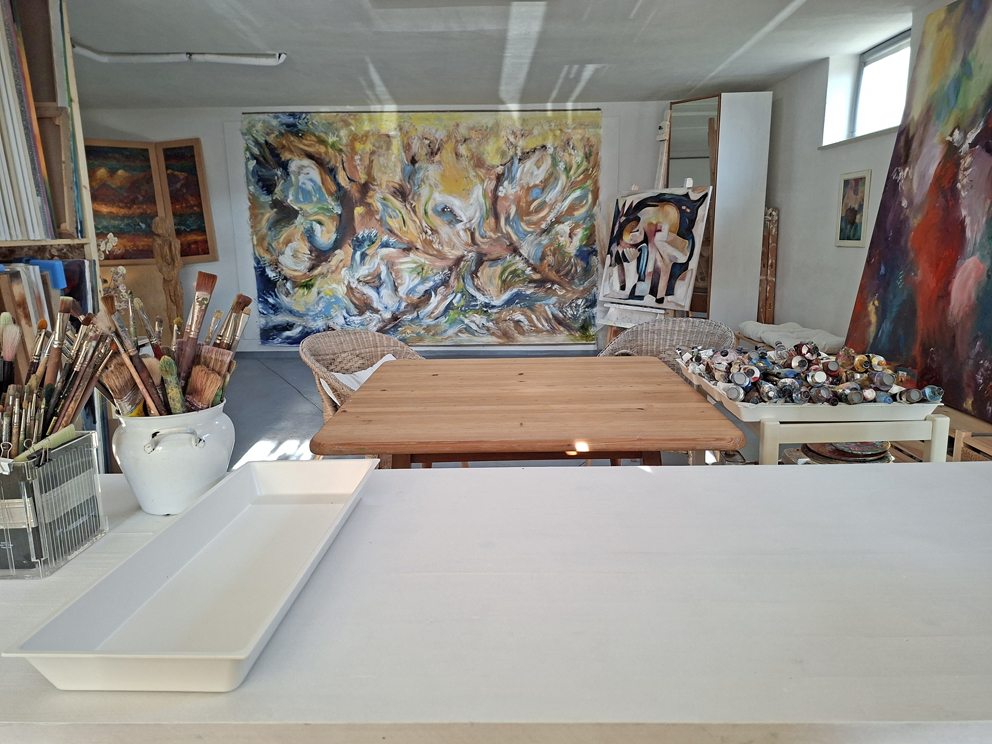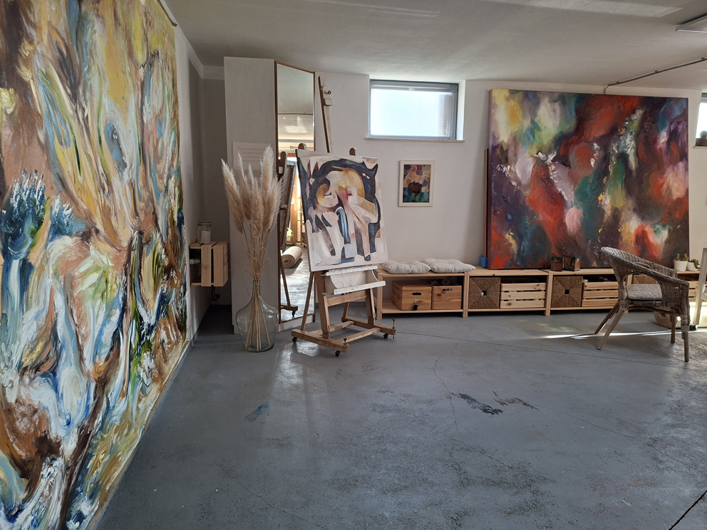 In the oilpainting GOLGOTHA from the Eremitage-series, 2022, my own experience with women’s care work came to the fore. In the artistic expression only the intensity counts, in which the sensual, body-related momentum takes on present form, in order to produce the content that transcends the subjective space of experience. A density of color and light developed through an expressive brushstroke, which describes the intensity that each individual experiences in the cycle of “becoming, being, and passing away.” In context of the EREMITAGE series, this also resulted in an iconological recourse to the Passion of Christ. Crucifixion and resurrection culminate in one pictorial representation, similar to medieval book illumination.