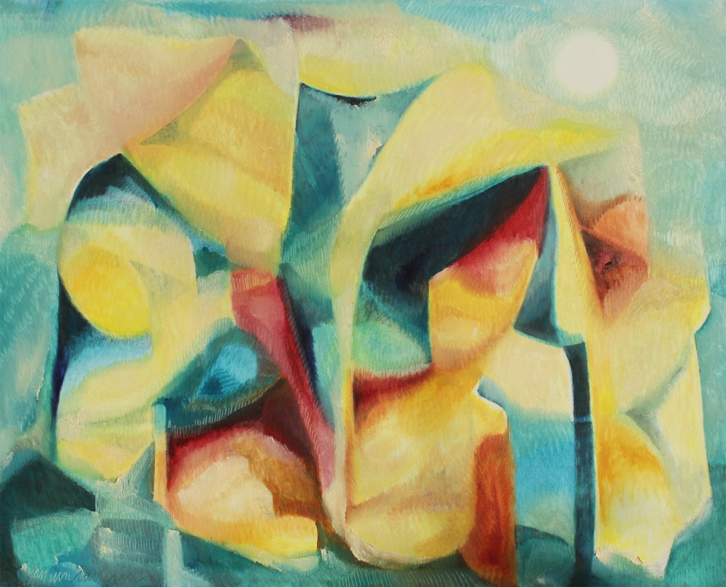 My painting essentially tells of pausing (stillness for contemplation), the EREMITAGE (hermitage) as a place of longing for the postmodern individual. A place, that in its literal sense, is hardly livable for an individual embedded in a hyper-pulsating world. It lives stronger as an inner place. It thrives as an individual experiential space, provided it is not rationalized away. This form of EREMITAGE does not imply a withdrawal from self- and world-experience. Instead, it involves a devotion to the unpredictable in the current moment. What is interrupted in the act of pausing is the person who voluntarily objectifies themselves through an activity focused on utility and function.